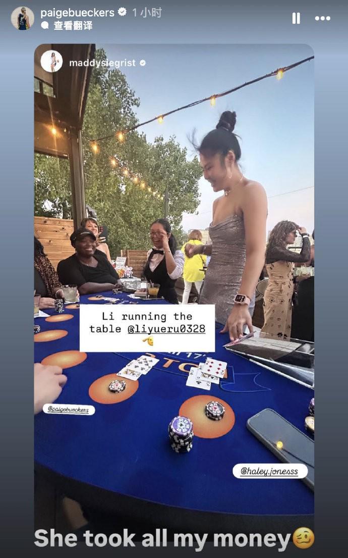 北京时间今日,中国女篮国手李月汝与自己在WNBA达拉斯飞翼队的队友们一同外出游玩,她们一起玩了Blackjack(21点)。在视频中,李月汝身穿抹胸连衣裙,正在为队友们发牌,她的这副打扮也非常美丽,并且她也很好地与队友们进行着游戏。飞翼队队员西格里斯特在社媒上晒出了李月汝的照片并配文写道:“李月汝连续获胜”,另一位队友佩奇则转发写道:“她赢走了我所有的钱。”...